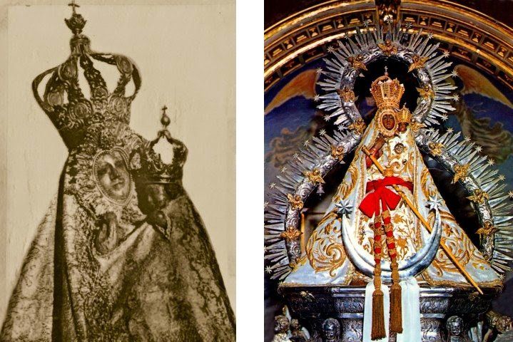 Primitiva imagen de la Virgen de la Cabeza desaparecida durante la guerra civil española y actual talla de la Virgen de la Cabeza que se venera en el Santuario de Sierra Morena, en Andújar (Jaén) desde el año 1944